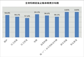 ――定期检验:共对 495113 台(条)在用特种设备进行了定期检验,定检率为 98.8%,其中,锅炉25011 台、98.8%,压力容器54045台、98.1%,电梯 282286台、99.1%,起重机械 85949台、98.6%,场(厂)内专用机动车辆 47075台、98.2%,游乐设施 728台、100%,客运索道 19条、100%,另检验压力管道 1613.94 千米。发现并督促企业处理质量安全问题 165618条,发现问题率 33.5%。