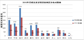 部委托下放各市局,同时严格实施网上受理和审批程序。2015年全省受理行政许可申请1296项,全年完成现场鉴定评审并批准换(发)证 905 本(包括 2015以前受理的行政许可申请、下同),其中省局书面和网上共办理 38 本,市局网上办理 867本,另有 7项申请不予许可。
