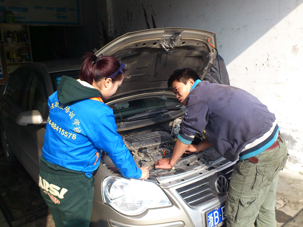 金亚学校的学员在学习汽车美容