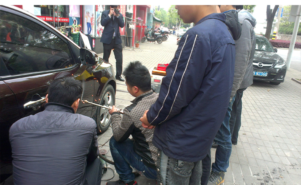 金亚学校汽车美容专业主要培训学员实用型技术,让学员在经过短短的培训之后就可以独立操作。4月17日汽车美容学员正在进行钣金练习。如下图,学员在进行钣金修复练习。