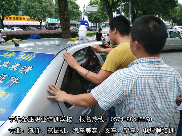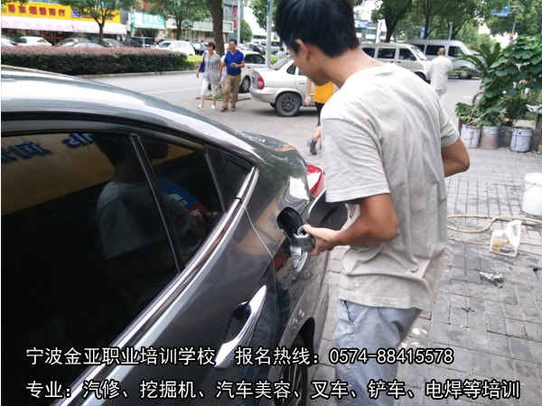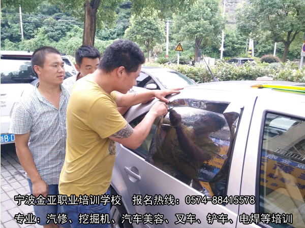 宁波金亚学校汽车美容专业,采用门店式教学,学员从零基础接触各种事故车型处理。教练手把手教学,在教学的过程中指导学员注意一些细节等知识。下面是教练在指导学员进行实际操作施工的图片