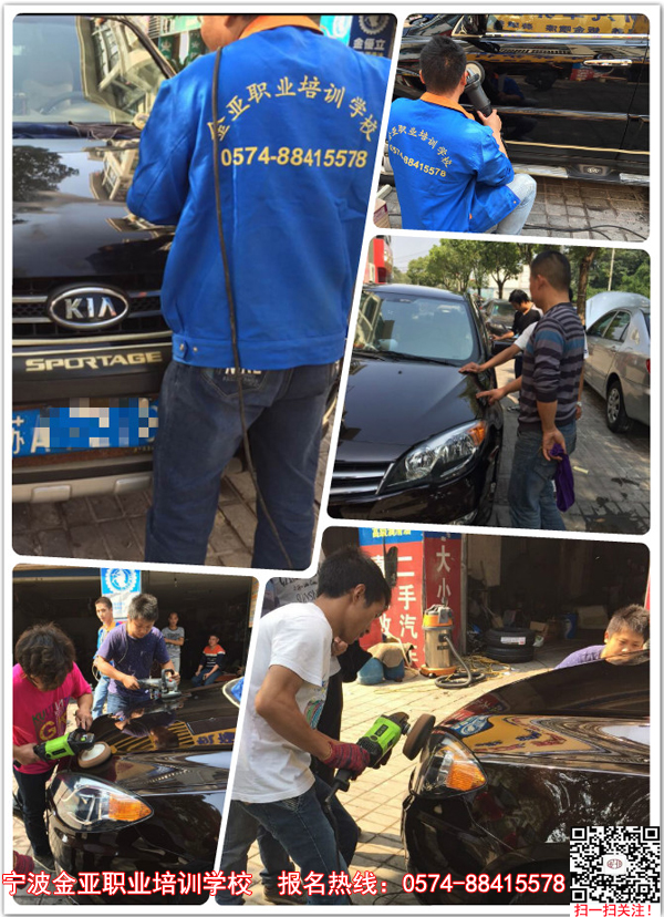金亚学校汽车美容教学特色:学员在教练的指导下做抛光打蜡等施工。经验是在练习当中积累起来的,多问、多做、多练、多交流、积极、主动是金亚每一个学员的特点。宁波金亚学校欢迎更多这样的你加入!