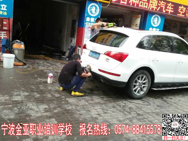 宁波金亚学校汽车美容装潢专业采用门店式教学,教练手把手指导,学员可在教练的指导下进行各个科目施工。本专业教学用车为低、中、高档次。11月16日,本次施工车型为奥迪,学员动手给奥迪车进行抛光施工。本专业学习的优势是:采用一次性收费,中途不在收取任何费用;循序渐进的教学,学员可在教练的指导下进行各项施工操作;教学车型多,学员可以在学习的过程中积累操作经验,同时积累与客户交流的经验,一举二得!毕业即可上岗,不用再经过繁琐的实习工作,毕业即可上岗上班!