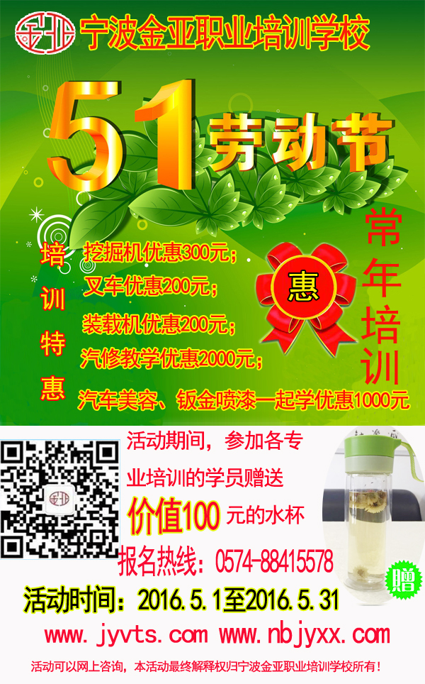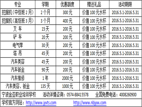 为迎接“5.1”劳动节,宁波金亚学校特推出“5.1”报名优惠活动!活动期间,报名金亚学校挖掘机专业、铲车(装载机)专业、叉车专业、电焊专业、汽修专业、汽车美容专业等,不仅享受200-2000元优惠,而且还可以领取一份精美礼品!时间有限,报名从速!请广大社会各界朋友相互转告,莫失良机!