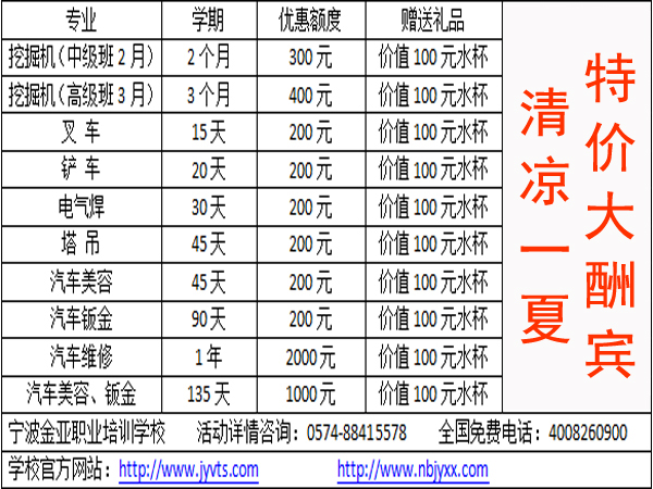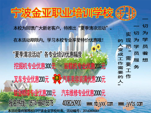 宁波金亚职业培训学校是浙江省诚信办学单位,专业培训挖掘机、叉车、铲车、汽车美容、汽车维修,学校规模大,实操多,中途不收费! 为了回馈社会各界关注支持宁波金亚学校的朋友,本校特推出“夏季清凉活动”。凡报名参加我校专业培训的朋友,均享受200-2000不等的优惠,培训还赠送价值100元水杯,时间有限,莫失良机!报名咨询热线:0574-88415578 4008260900