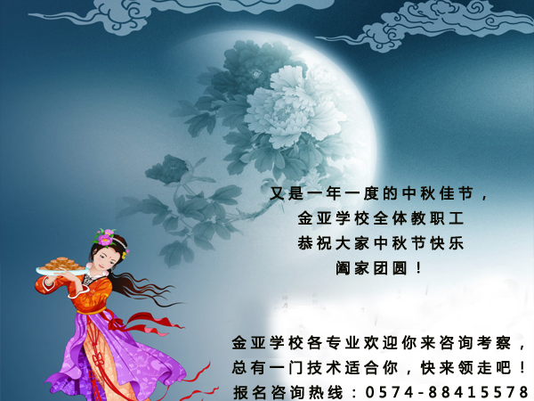 又是一年一度的中秋佳节,金亚学校全体教职工恭祝大家中秋节快乐,阖家团圆!金亚学校各专业欢迎你来咨询考察,总有一门技术适合你,快来领走吧!报名咨询热线:0574-88415578